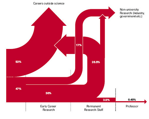 With any cohort of individuals there is always a distribution of possible outcomes, some start out not knowing what they want and finding that the path they chose is not for them, they leave early. Others are committed from the start but discover new passions and inspirations along the journey. They leave after completing undergrad. Yet others are driven by discovery and are uncertain where to go so follow the well trodden paths through undergrad to postgrad to postdoc only to discover in the end that the long term pursuit of knowledge is not what drives them. They pivot to industry or finance applying the skills of analytical thought, problem solving, resilience and tenacity honed through years of academic challenges. The final few push on and strive to make a life in academia, pushing to become professors and faculty to build a program of research that spans the years. The current reality is that over the past half a century the progress in education across the board has produced so many more graduates and doctorates than could ever be supported by the current academic system. My lament, is that for those from my cohort that wanted the academic path and pushed beyond their PhD through early careers in research so many of us (myself included) have been forced to choose paths outside of academia. A report from the UK Royal Society in 2010 suggested that of students that commence an undergraduate degree in STEM only 3.5% are able to secure long term positions in academic research and only 0.45% make it to be a Professor.
